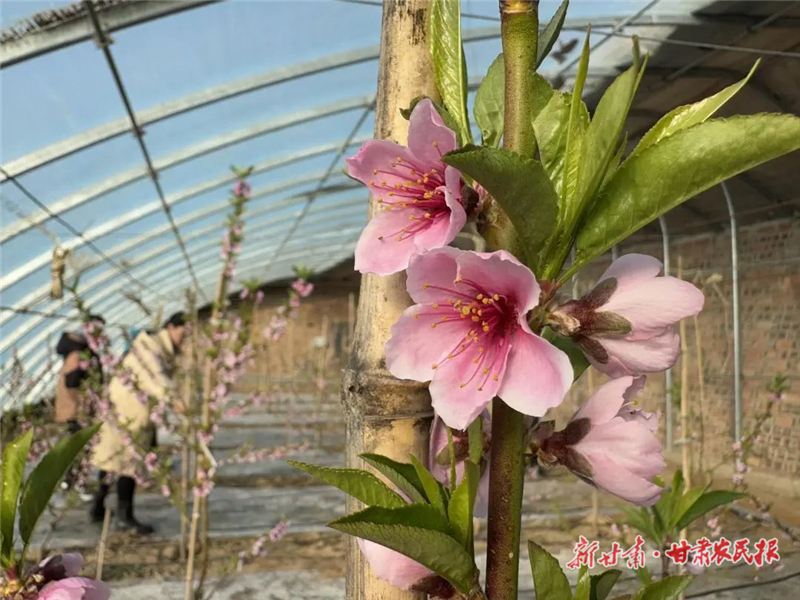 在古浪縣干城鄉(xiāng)愛民新村的設(shè)施油蟠桃大棚內(nèi),桃花競相綻放、嬌艷動人,散發(fā)出春天的氣息,孕育著豐收的新希望。