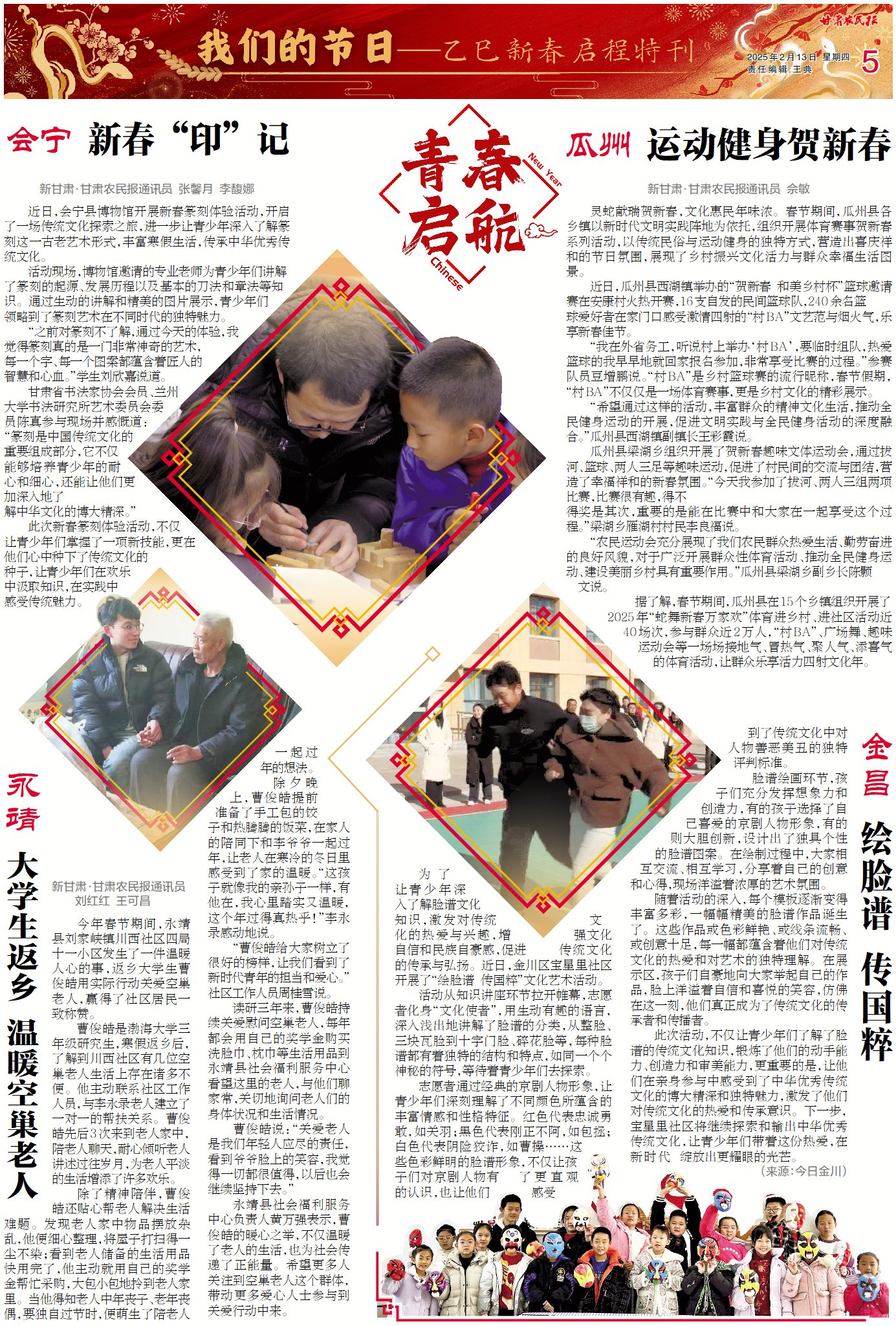 我們以“歲啟新程”為筆,描繪隴原兒女對美好生活的向往;以“消費(fèi)熱潮”為鏡,映照新時代發(fā)展的蓬勃脈動;以“隴上食趣”為媒,傳遞舌尖上的鄉(xiāng)愁記憶;以“非遺鬧春”為窗,展現(xiàn)非遺與傳統(tǒng)文化的獨(dú)特魅力,更有“文明新春”“青春起航”“游春納客”“喜樂元宵”等篇章,帶您領(lǐng)略新時代的隴上春韻。