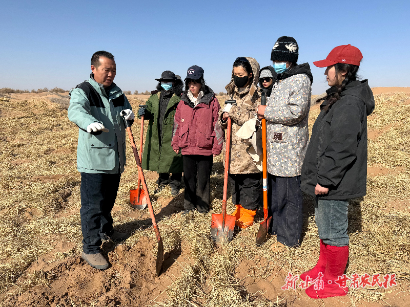 馬俊河為志愿者講解栽植梭梭要領(lǐng)。新甘肅·甘肅農(nóng)民報通訊員張小芳 攝
