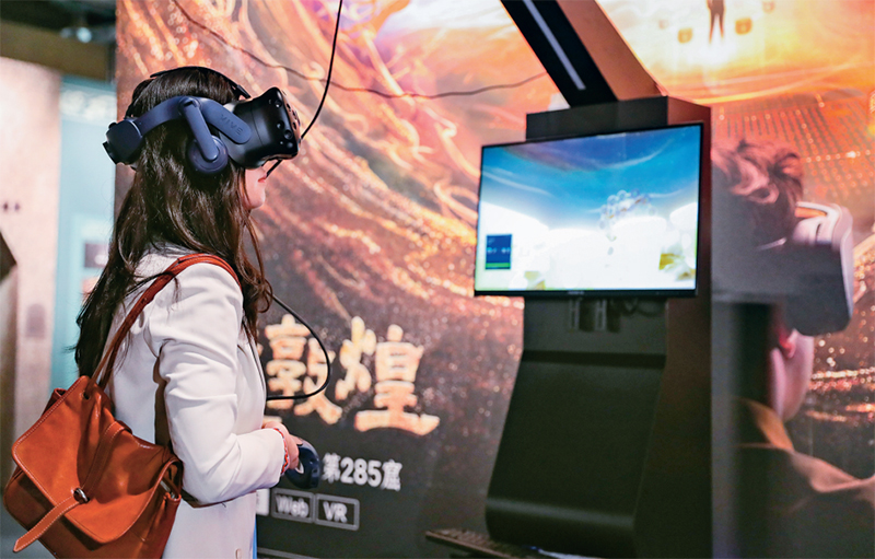 近年來,甘肅不斷深化文化體制機制改革,推動優(yōu)秀傳統(tǒng)文化創(chuàng)造性轉(zhuǎn)化、創(chuàng)新性發(fā)展,文化旅游業(yè)綜合效應(yīng)持續(xù)放大。圖為2024年9月21日,在第七屆絲綢之路(敦煌)國際文化博覽會上,與會嘉賓借助VR設(shè)備沉浸式游覽莫高窟虛擬場景。 新華社記者 郎兵兵/攝