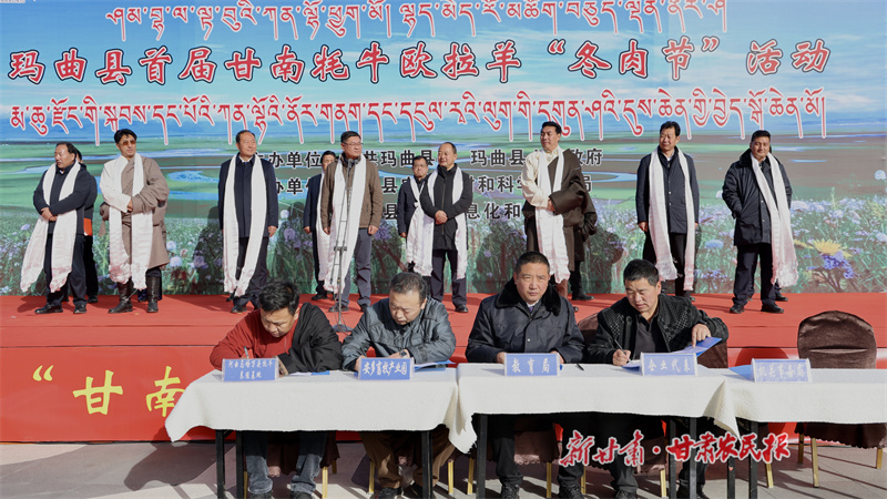 啟動(dòng)儀式上,瑪曲縣與牛羊收購代表、電商代表、合作社或家庭牧場代表、安多畜牧產(chǎn)業(yè)園區(qū)等簽訂甘南牦牛歐拉羊供銷收購協(xié)議。