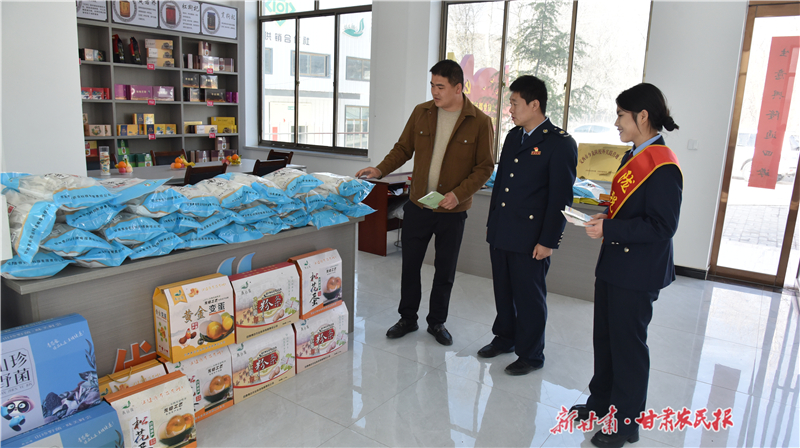 稅務干部向農特產品經銷商宣傳稅費優(yōu)惠政策。