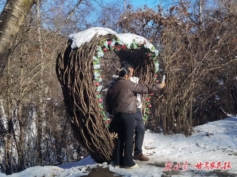 趁著冬日的暖陽,許多游客紛至沓來,都被這絕美的景色所震撼。年輕的情侶在用枝條做成的愛心中打卡拍照,滿臉幸福地感慨:“這里拍照太出片了,咱們多留點浪漫的回憶。”家長們帶著孩子,滿眼歡心地看著孩子在雪中嬉戲,“孩子們在雪地里盡情玩耍,開心得不得了?!?/p>
