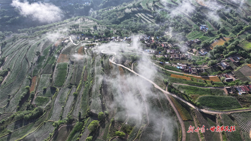 一場新雨過后,莊浪縣的百萬畝梯田云霧繚繞,宛如仙境。從高空俯瞰,層疊的梯田如大地的年輪,在薄霧中若隱若現(xiàn),勾勒出一幅流動的水墨畫卷。