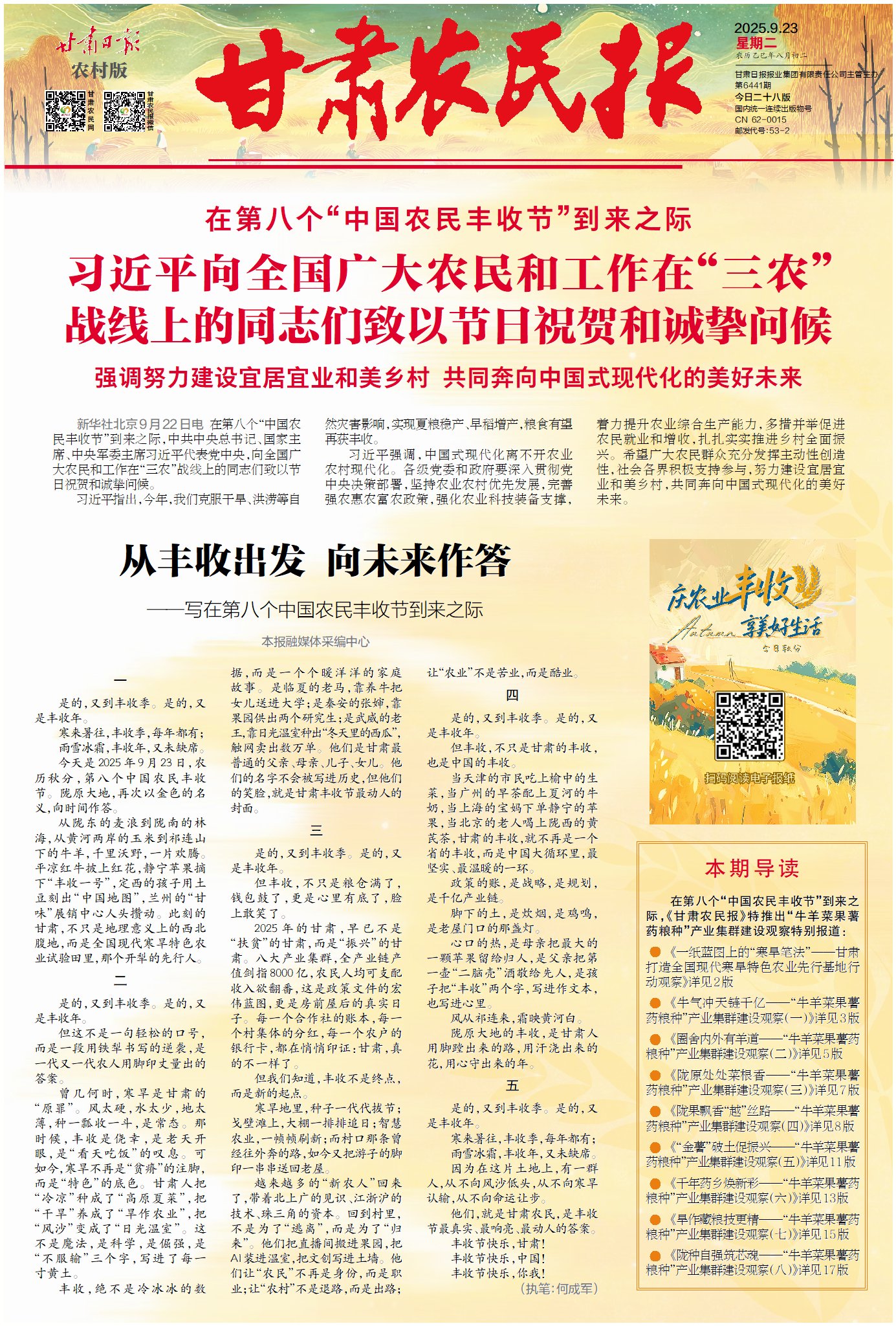 今天是2025年9月23日,農(nóng)歷秋分,第八個(gè)中國(guó)農(nóng)民豐收節(jié)。隴原大地,再次以金色的名義,向時(shí)間作答。