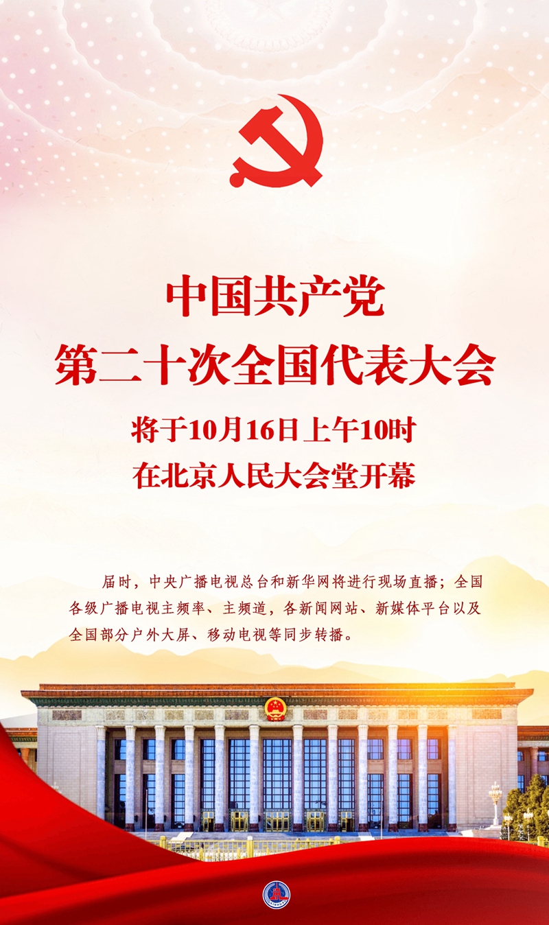 新華社北京10月14日電 中國(guó)共產(chǎn)黨第二十次全國(guó)代表大會(huì)將于16日上午10時(shí)在北京人民大會(huì)堂開幕。